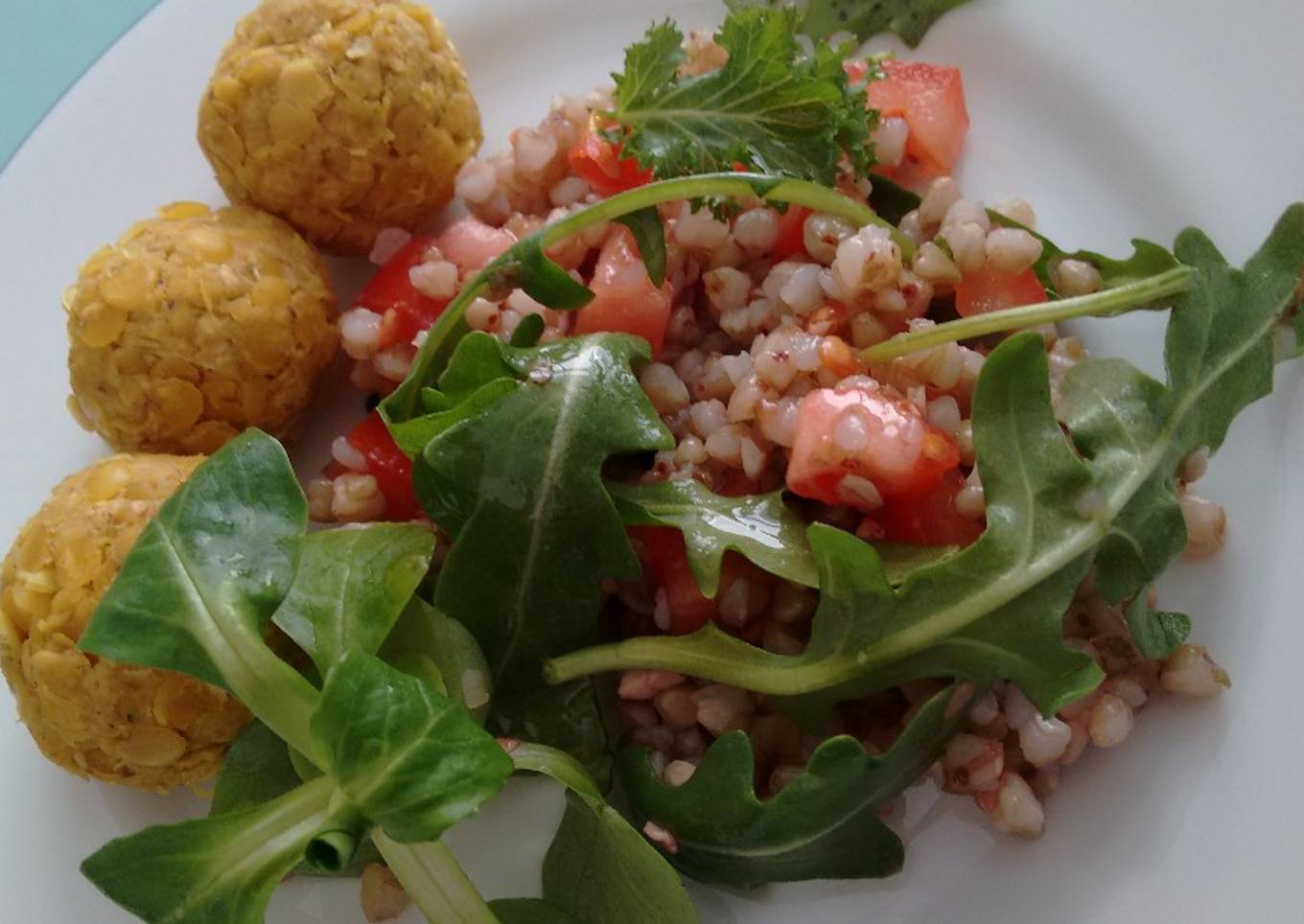 Bolitas de lentejas rojas con ensalada verde y espelta enriquecida en Agua de mar💦🍽