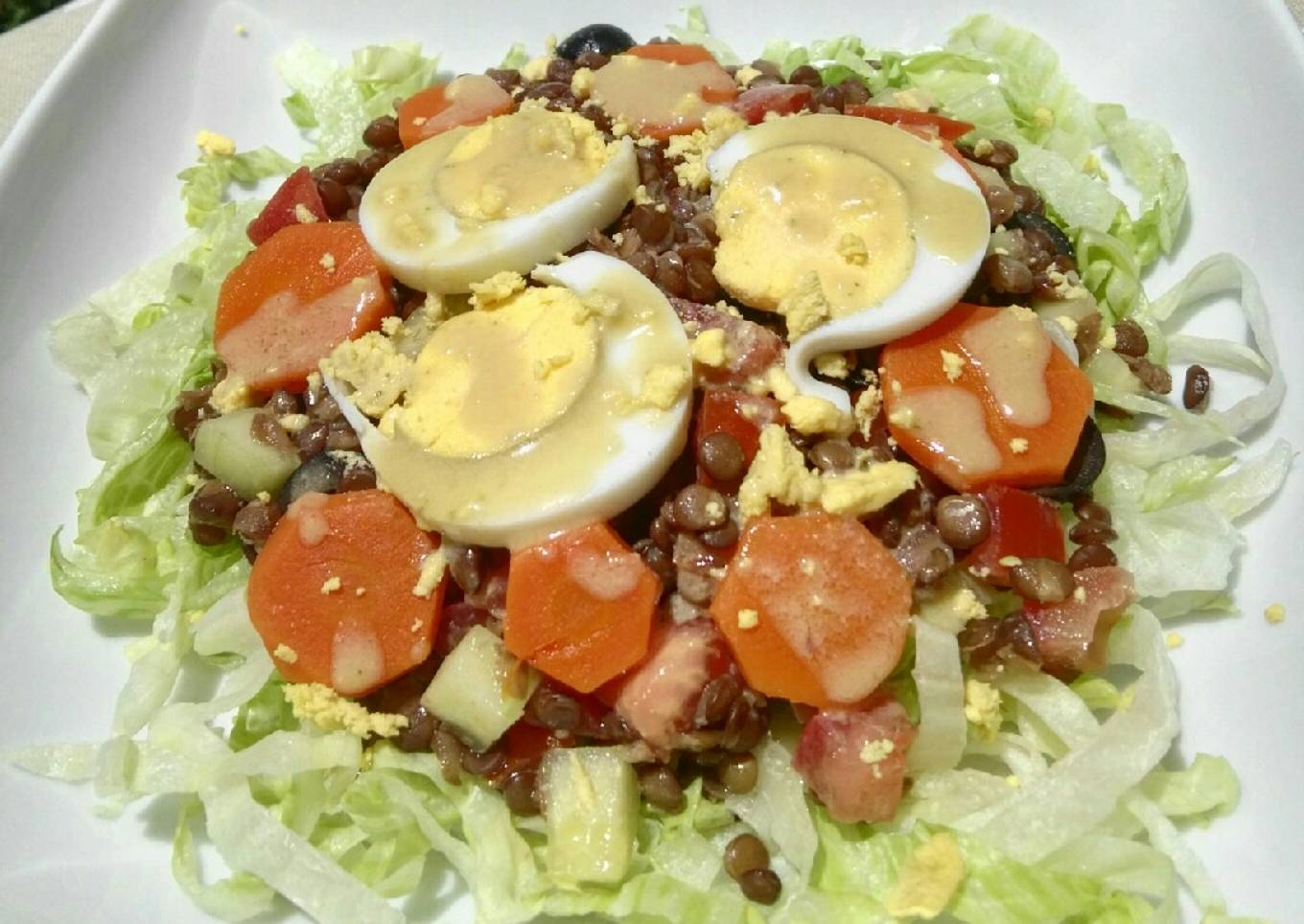 - Sobre las lentejas ponemos las rodajas de zanahoria y las rodajas de huevo. Añadimos un poquito más de la vinagreta
