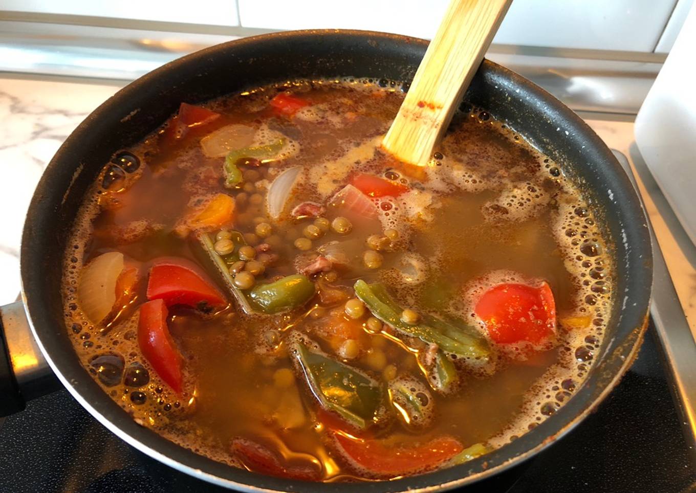 - Se añade pimentón y se deja sofreír unos segundos. Después se añade laurel, agua al gusto, lentejas y avecrem. Cuando comience a hervir bajar a fuego medio 30 minutos.