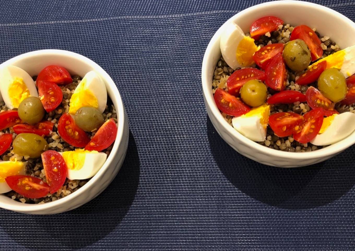 - Dentro un bol, poner para cada comensal, 4 cucharas de lentejas con boulgour, cortar los tomates cherry en 4 y los huevos duros también.