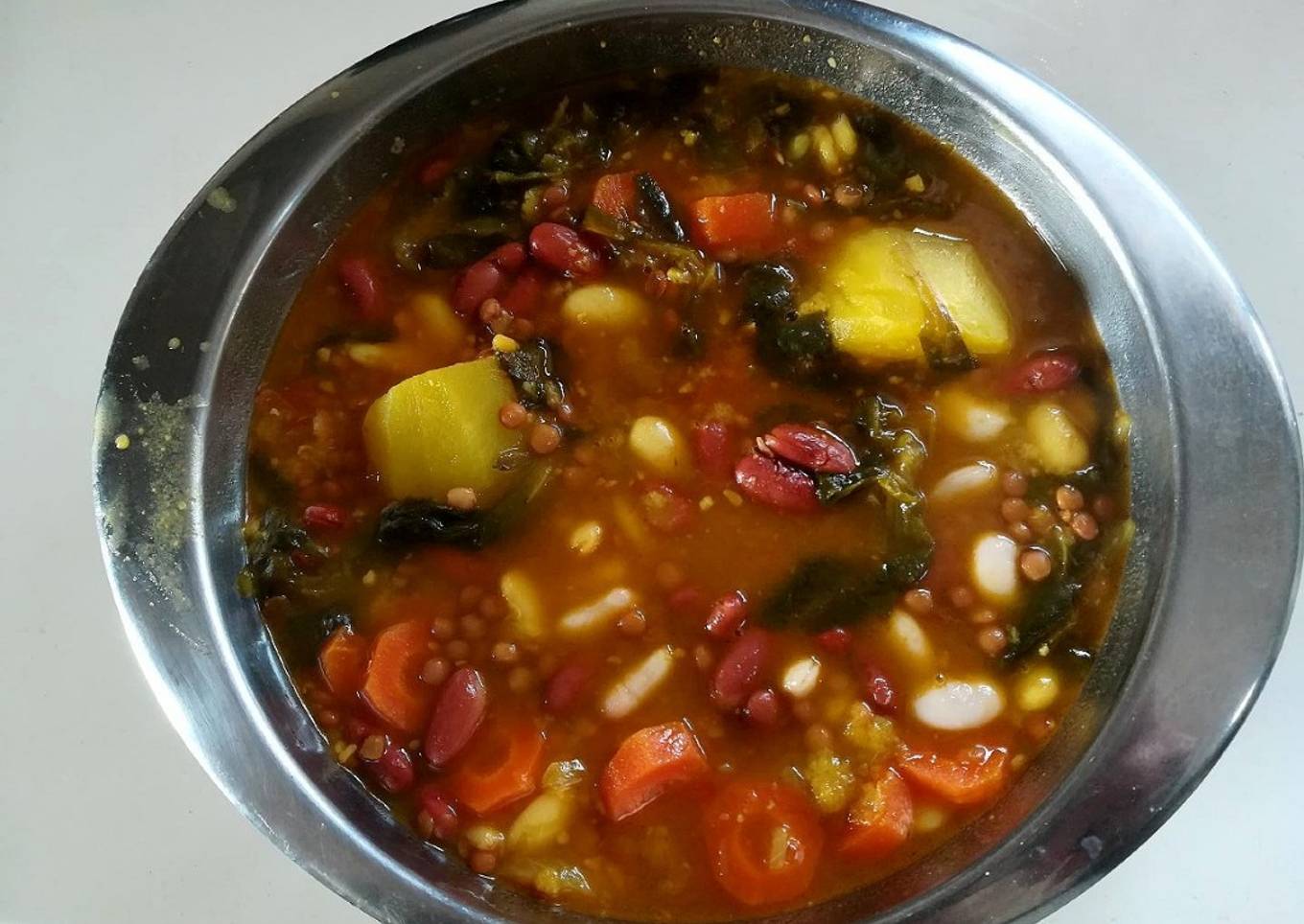 - Rehogamos la cebolla cuando transparente echamos el tomate rehogamos junto. Sacamos del fuego y añadimos el pimentón, pasamos el sofrito a una olla, echamos agua en la sartén para que se lleve todo el resto. Ponemos la patata en trozos, la zanahoria en rodajas, los canónigos, la picada. Salpimentamos y cubrimos de agua. Cuando la patata esté, echamos las legumbres, dejamos hervir todo junto 5 minutos;Ha de reposar un poco