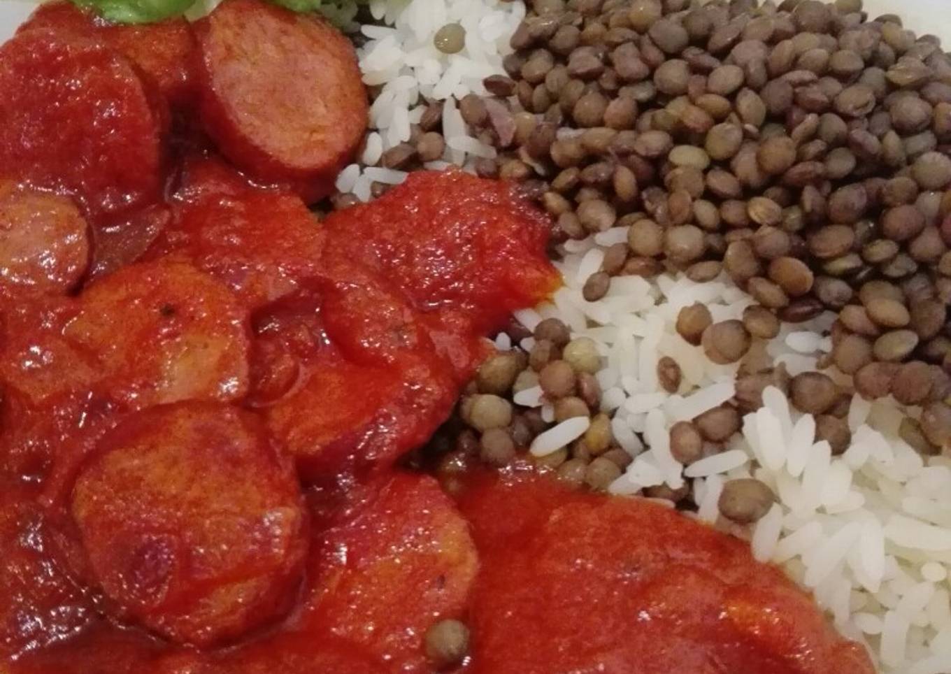 - Durante el tiempo de cocción del arroz y las lentejas pelar la otra cebolla, picarla y freírla lentamente en una sartén con un poquito de aceite de oliva, incorporar las salchichas en rodajas y añadir el bote de salsa de tomate, cúrcuma, pimentón, jengibre rallado a gusto y sal.