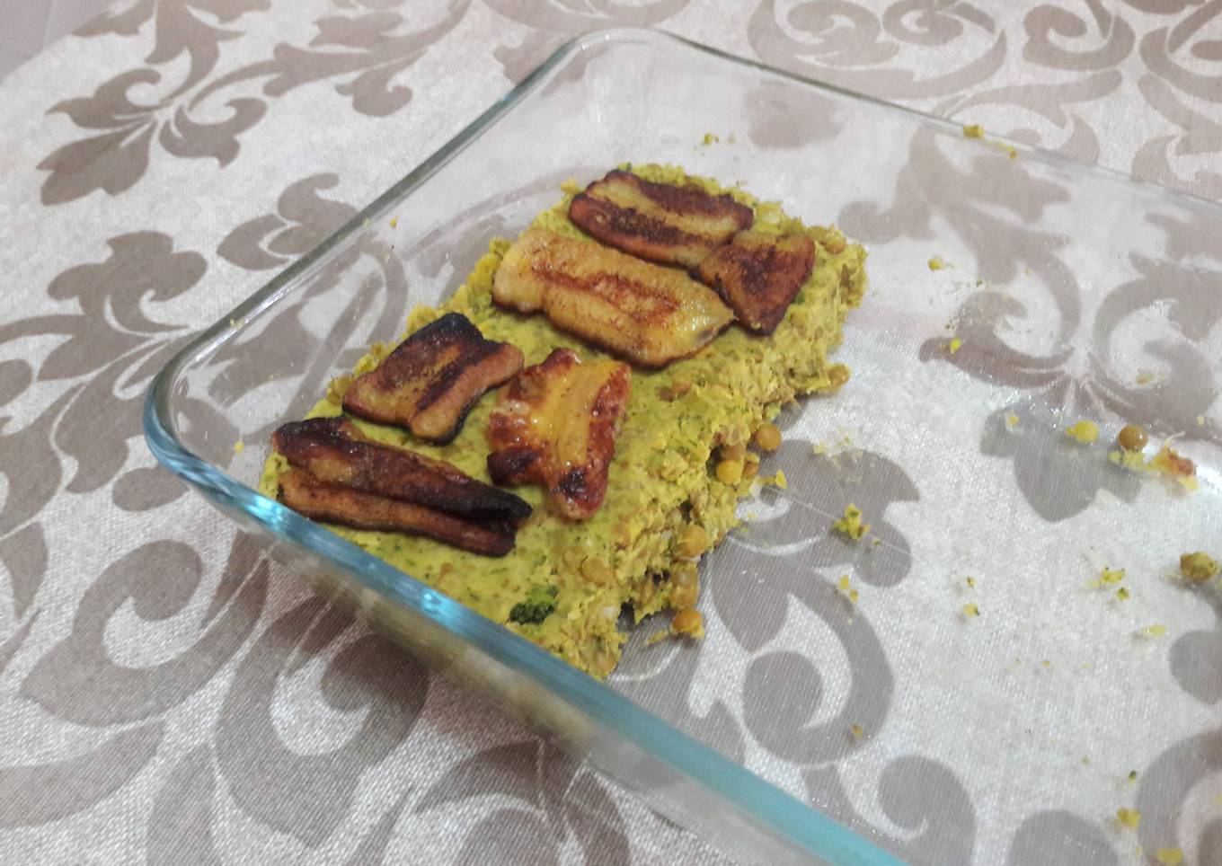 - En un recipiente de horno poner una capa de plátano, otra de la mezcla de las lentejas, otra de plátano, otra de la mezcla y una última de plátano.