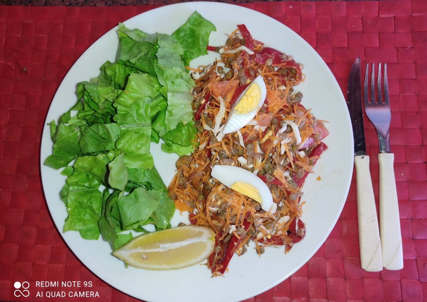 - Cuando tenemos todo pronto.mezclar las lentejas con la cebolla, morrón, zanahoria, tomate, huevo rallado y servir con la lechuga