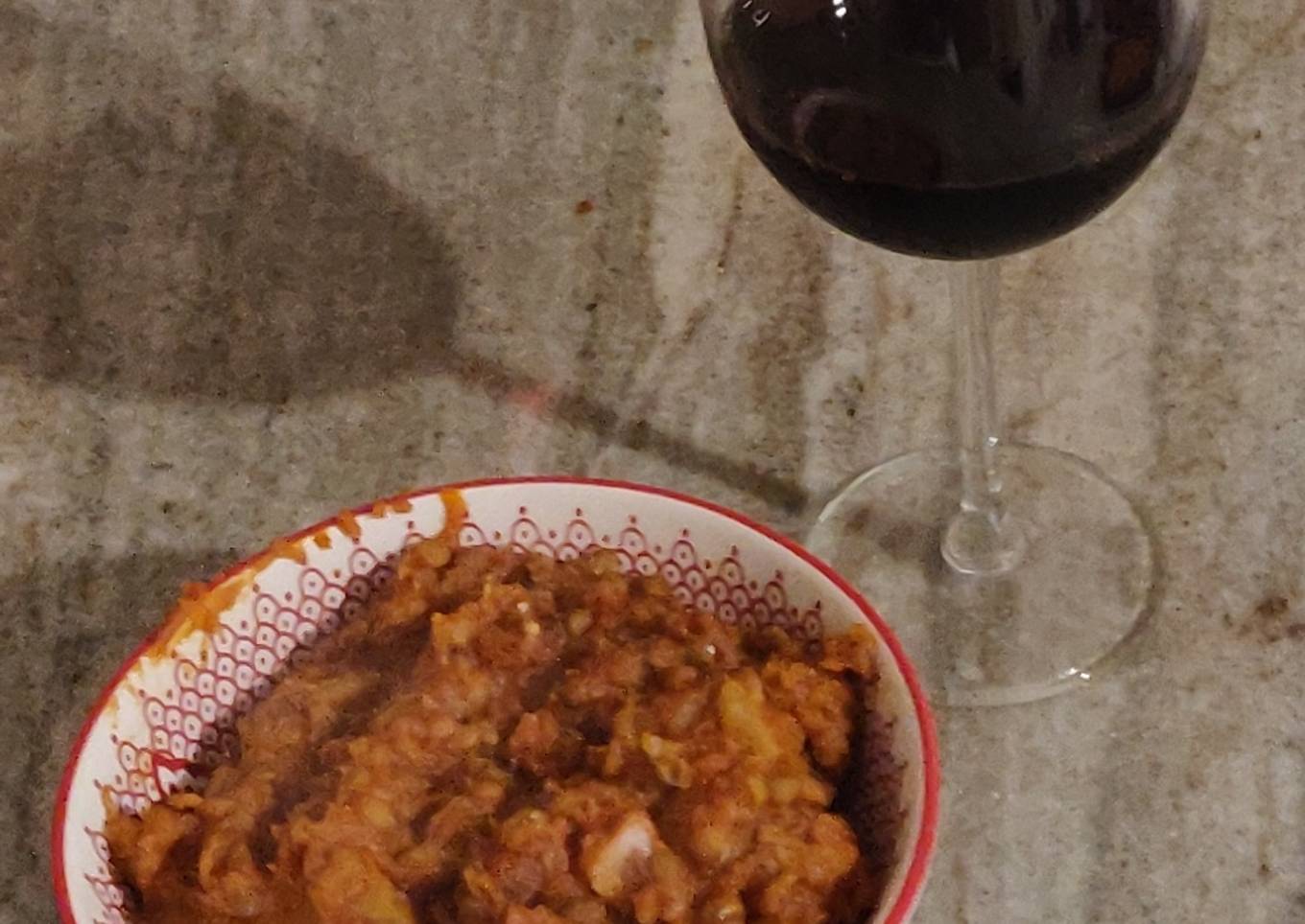 - Sumar el 1kg entre papas y batatas, agregar 500g de puré de tomate, condimentar con: pimienta, ají molido, jengibre, etc pero no salar. Agregar un poco de vino tinto y una pizca de bicarbonato de sodio para quitar acidez de la salsa. Cocinar por 30 minutos a fuego bajo.