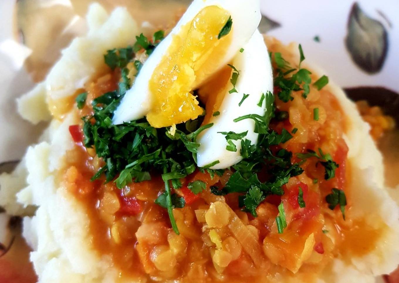- Servir junto al puré como si fuera una salsa, y adornar con perejil y un huevo, semiduro.