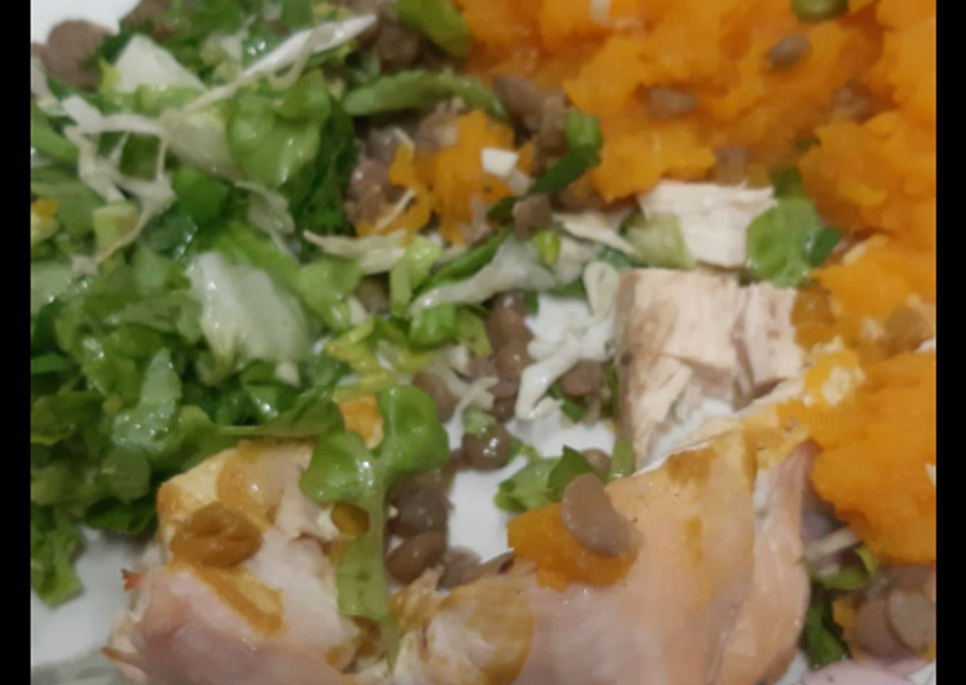 Ensalada de pollo, lentejas, calabacín y verdes