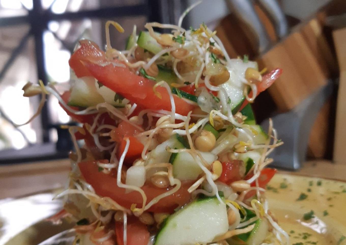 Hey everyone, hope you're having an amazing day today. Today, I'm gonna show you how to prepare a distinctive dish, Ensalada de tomate, pepino y germinados de lentejas. It is one of my favorites. For mine, I will make it a little bit tasty. This is gonna smell and look delicious.