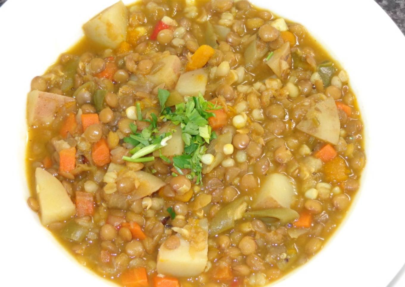 Lentejas con mote y vegetales
