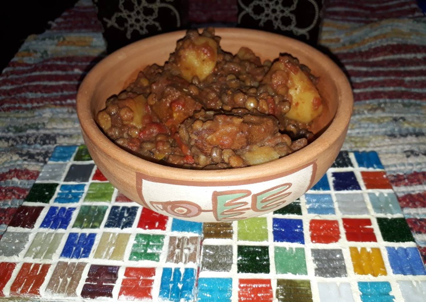 - Una vez ya bien dorada las cebollas y morrones junto a la carne agreg贸 la pulpa de tomate y dos cucharones de caldo, tap贸 la cacerola en este caso para el guiso volv铆 a usar mi s煤per cacerola de barro que amo y deja un sabor especial. Mientras tanto en otra cacerola las papas y lentejas se van preparando.Una vez que estas 煤ltimas est谩n casi tiernas con un colador de mano las voy pasando a la cacerola de barro con la salsa, all铆 dejo que se termine de cocinar. (Si es necesario se agrega +caldo)