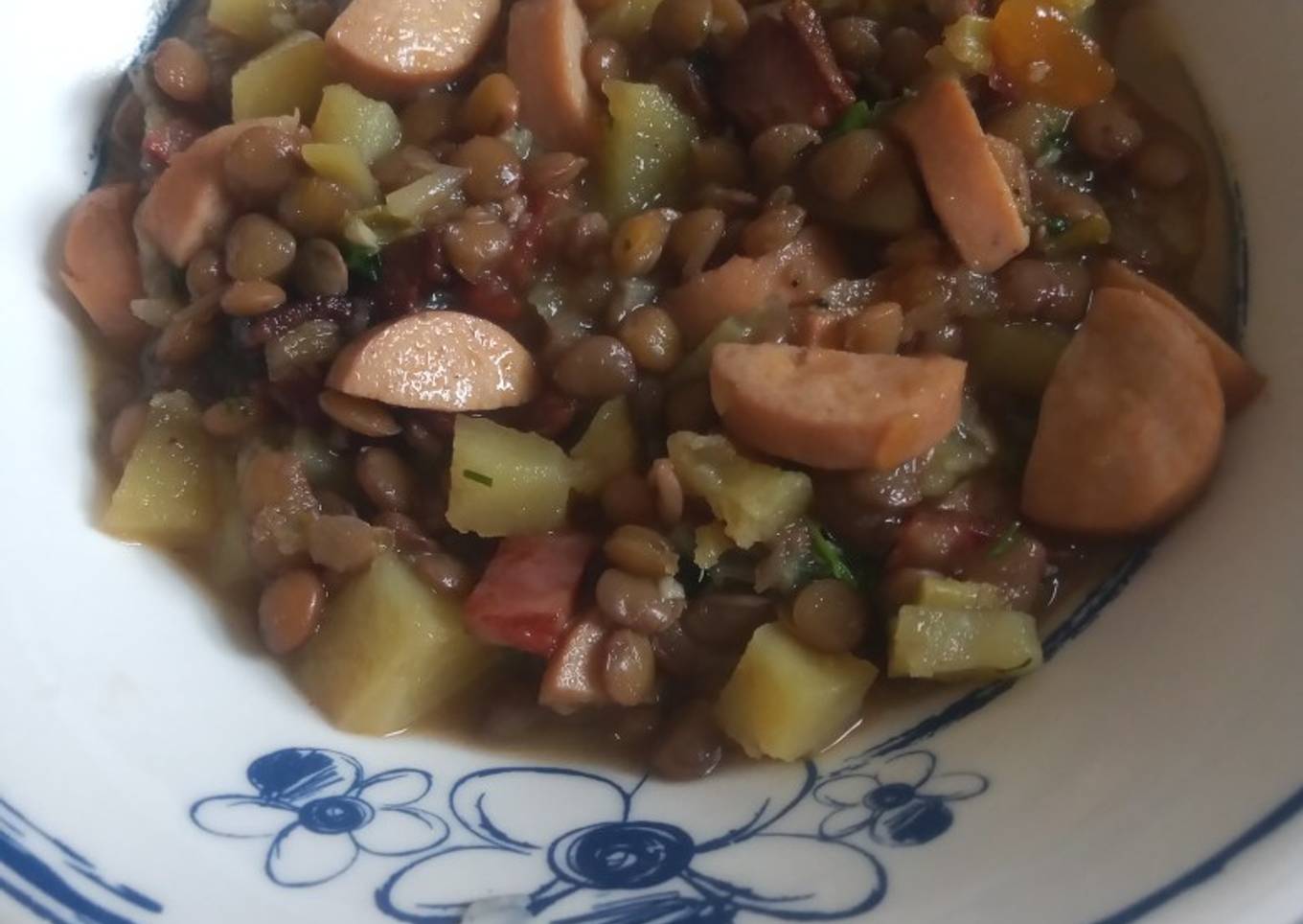- Colocar a cocinar las lentejas hasta que estén blandas. Añadir las papas, las salchichas, el hogao, la sal, la pimienta, revolver. Tapar y cocinar por 40 minutos