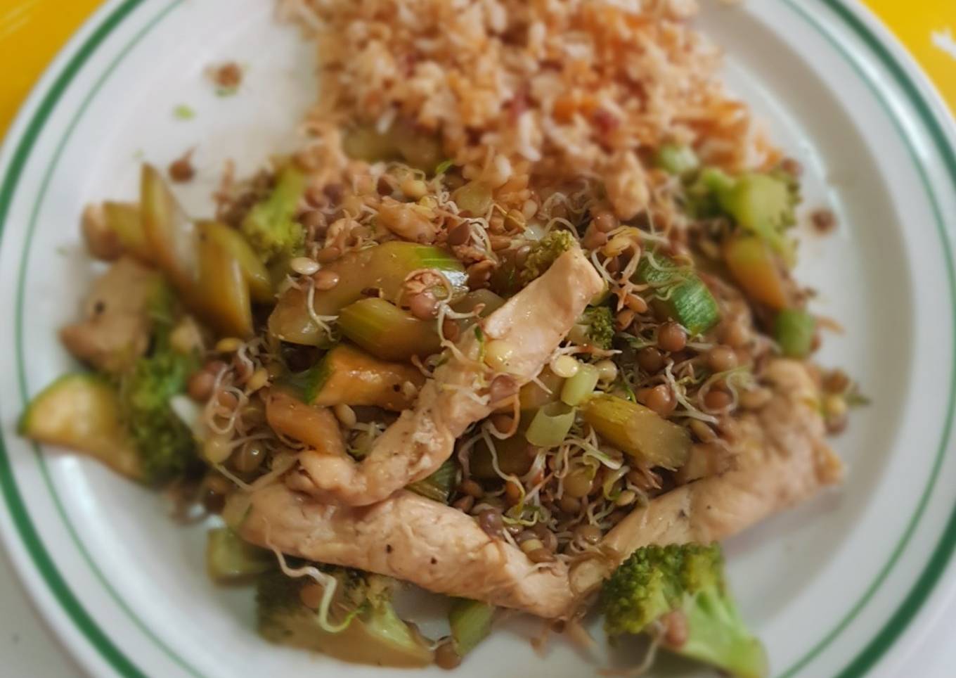 Salteado de pollo con germinados de lenteja